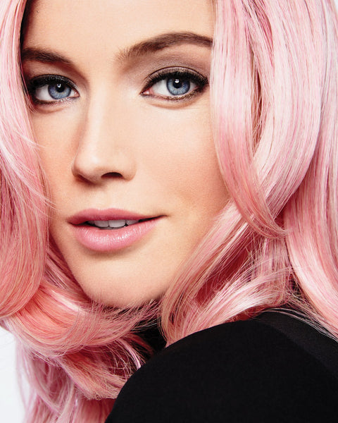A Pretty In Pink Favorite! A playful shade of pink makes this classic layered cut anything but ordinary! The dark root adds contrast and natural depth. Style it curled, waved, or even cut it short- this blushing beauty looks good at every angle and with any skin tone.